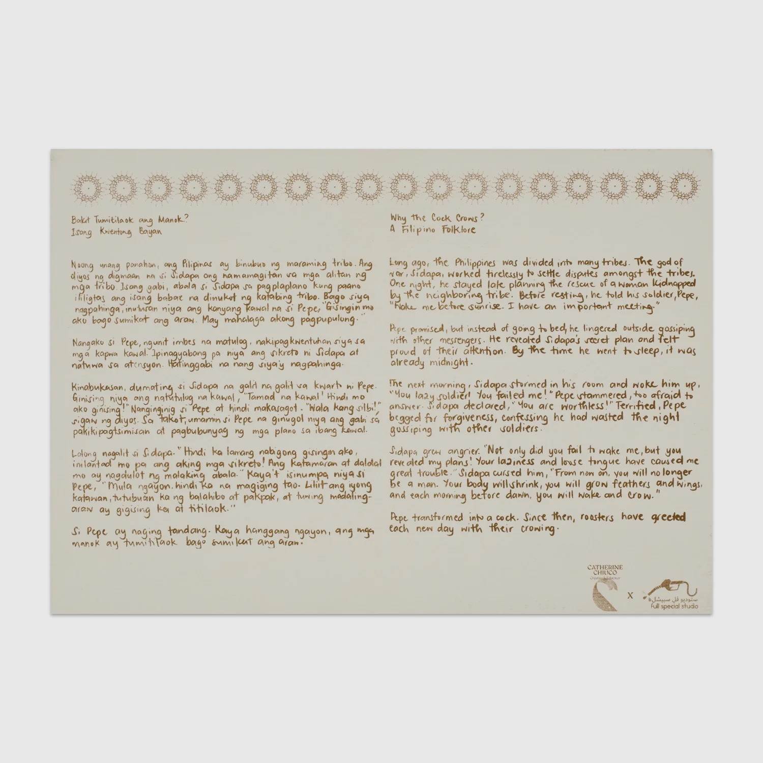 Catherine Chiuco is a designer, artist, and educator whose work explores the intersections of culture, identity, and purpose. She holds a BFA in Graphic Design from Virginia Commonwealth University in Qatar and a Postgraduate Certificate in Education from the University of Nottingham. Raised between the Philippines and Qatar, she draws from these perspectives to create work that connects people, memories, and places.