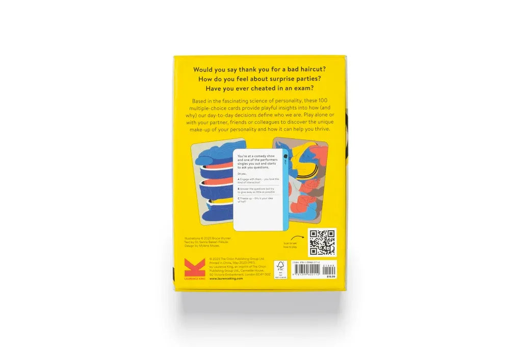 أنت في الحانة مع زملائك. تطلب زجاجة نبيذ للمائدة ولكن طعم النبيذ سيئ. لا يقول أي شخص آخر أي شيء ونصف الزجاجة قد سُكبت بالفعل ... أنت في حفلة تضم أكثر من 20 شخصًا، وتسد سيارة أحد الضيوف الممر. تحتاج إلى إلقاء خطاب أمام الجميع لمعرفة مالك السيارة ... يطلب منك أحد الأصدقاء اقتراض 300 جنيه إسترليني لتغطية الإيجار. يعدك بأنه سيعيد لك المبلغ في أقرب وقت ممكن. لقد فعل هذا ثلاث مرات في الماضي ولم يتمكن من سداده لك. تحتاج إلى إخباره أنك لا تستطيع إقراضه المال هذه المرة ... ماذا تفعل ... ؟ في هذه اللعبة الممتعة القائمة على العلم، تناوب على اختيار البطاقات والإجابة على الأسئلة حول سيناريوهات مختلفة تعتمد على الشخصية. في نهاية اللعبة، اجمع درجاتك واكتشف نوع شخصيتك الفريد. يساعدك الكتيب المقابل على تحليل شخصيتك ويوضح لك كيفية الاستفادة من رؤيتك المكتشفة حديثًا. العب بمفردك أو في مجموعات وتعرف على نفسك بشكل أفضل، وأنشئ علاقات أعمق مع الآخرين، واكتشف مدى توافقك واستفد من نقاط قوتك في أي موقف. من ابتكار خبير في علم نفس الشخصية.