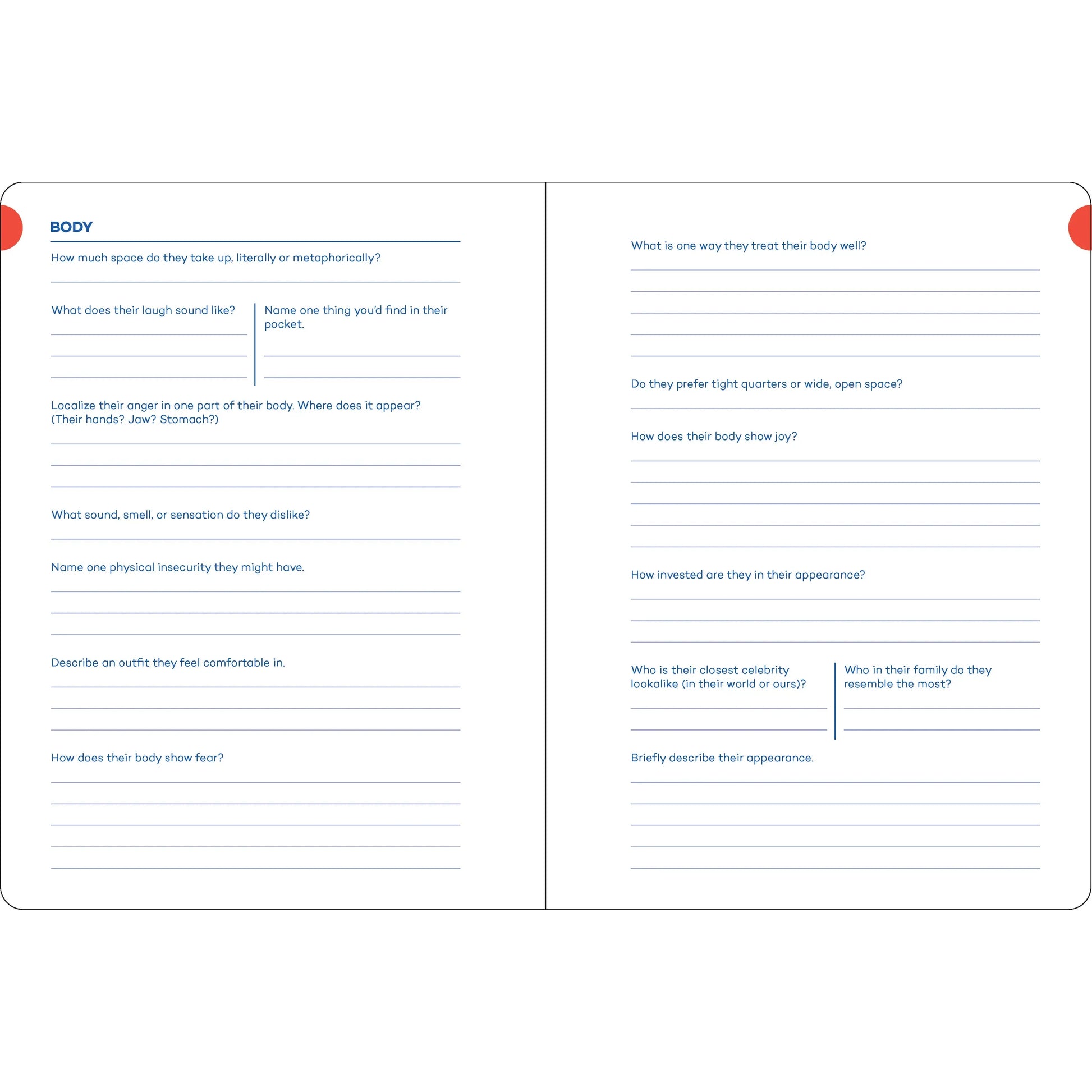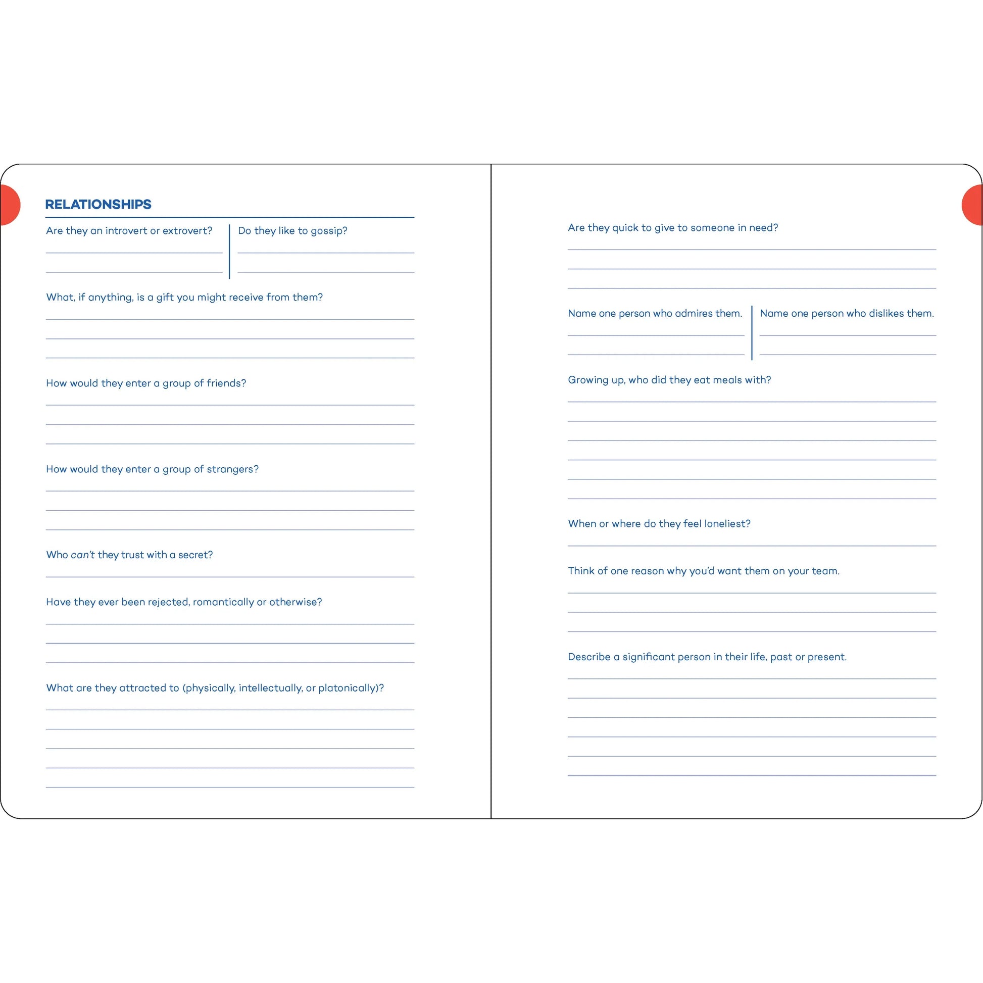 QUICK, EASY, AND FUN: For storytellers who have a hard time getting the ball rolling or want an easy creative exercise, these short, fun questions are designed to spark ideas and excite you about the character creation process. For those who prefer to grapple with big ideas, some questions allow for longer responses regarding a character’s thoughts, motivations, and backstory.