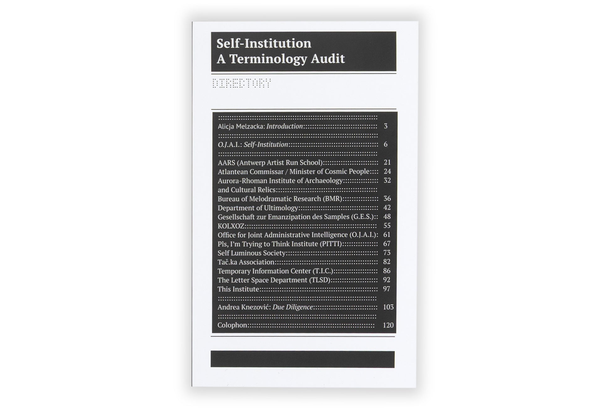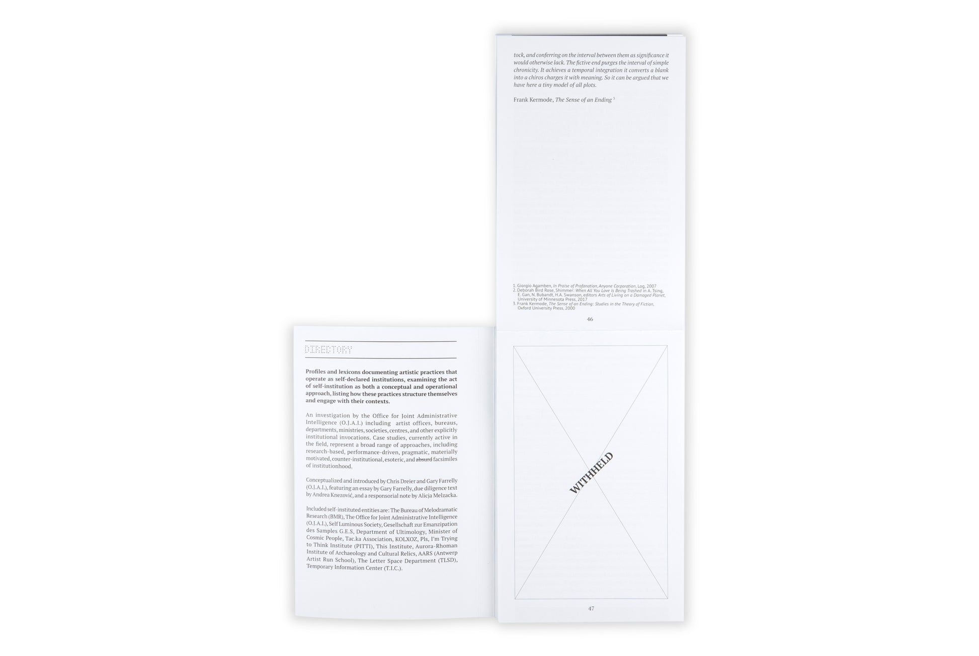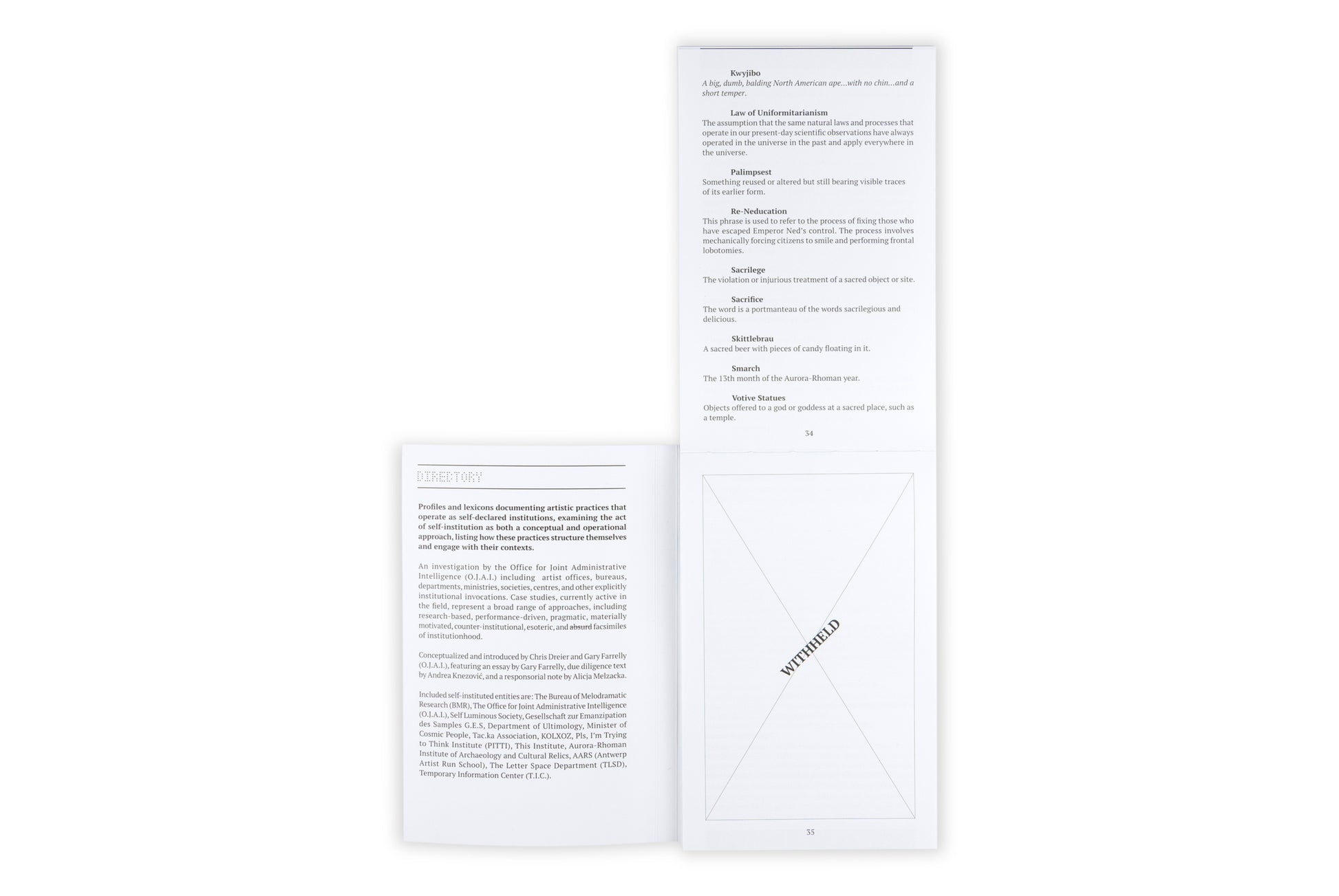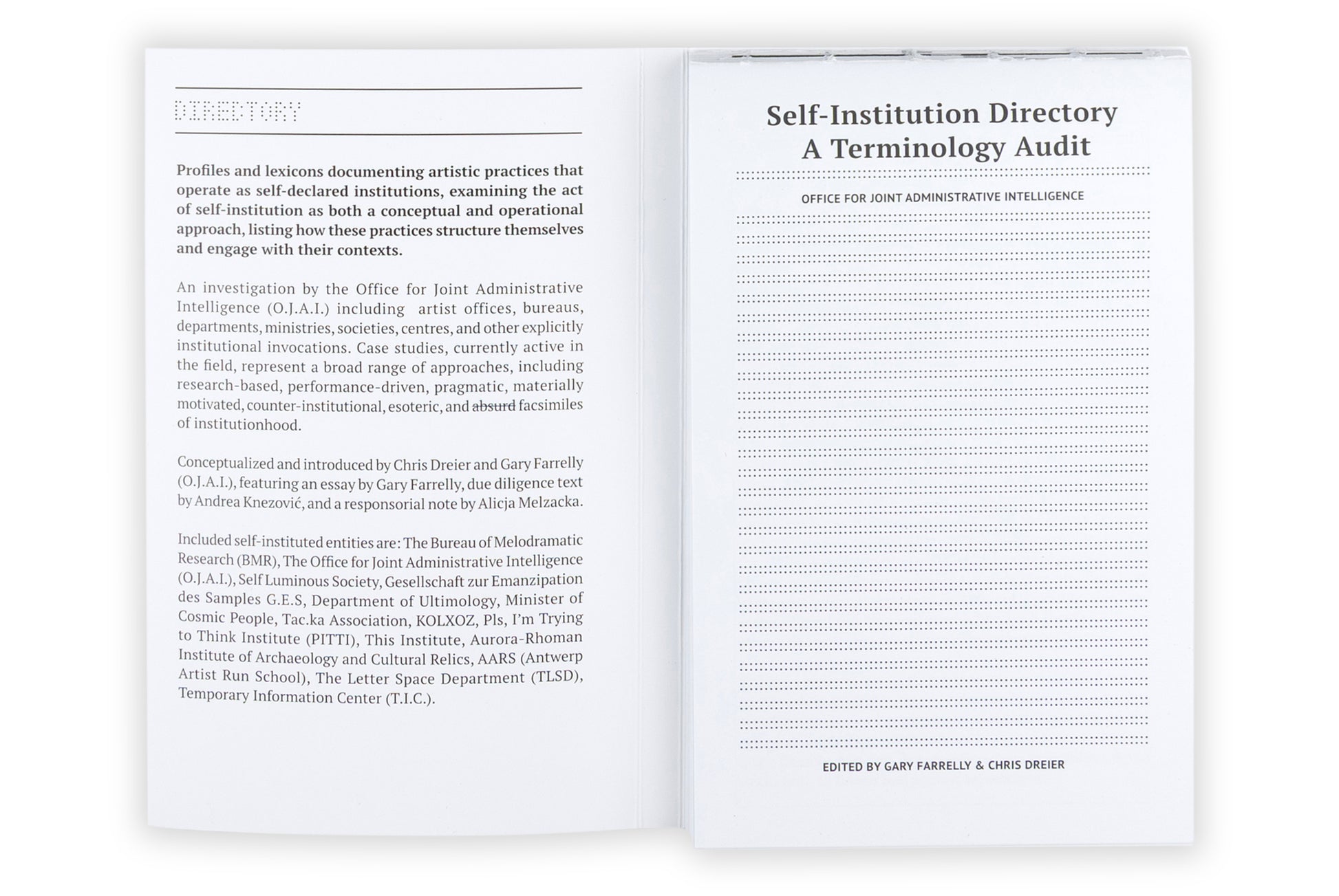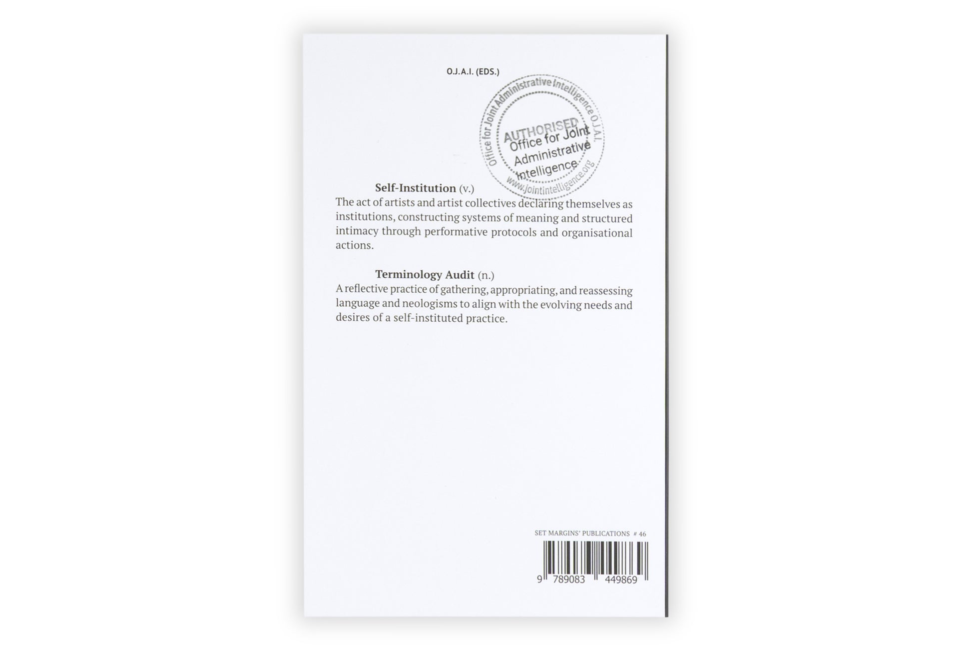 Initiated by the Office for Joint Administrative Intelligence (O.J.A.I.), Self-Institutionalization Reader investigates artist offices, bureaus, departments, ministries, societies, centers and other explicitly institutional invocations. It examines the act of self-institution as both a conceptual and operational approach, focusing on how these practices structure themselves and engage with their contexts. The Terminology Audit found within this reader reveals language and jargon unique to each practice. Meanwhile, the case studies from researchers currently active in the field represent a broad range of approaches, including research-based, performance-driven, pragmatic, materially motivated, counter-institutional, esoteric and absurd facsimiles of institutionhood.