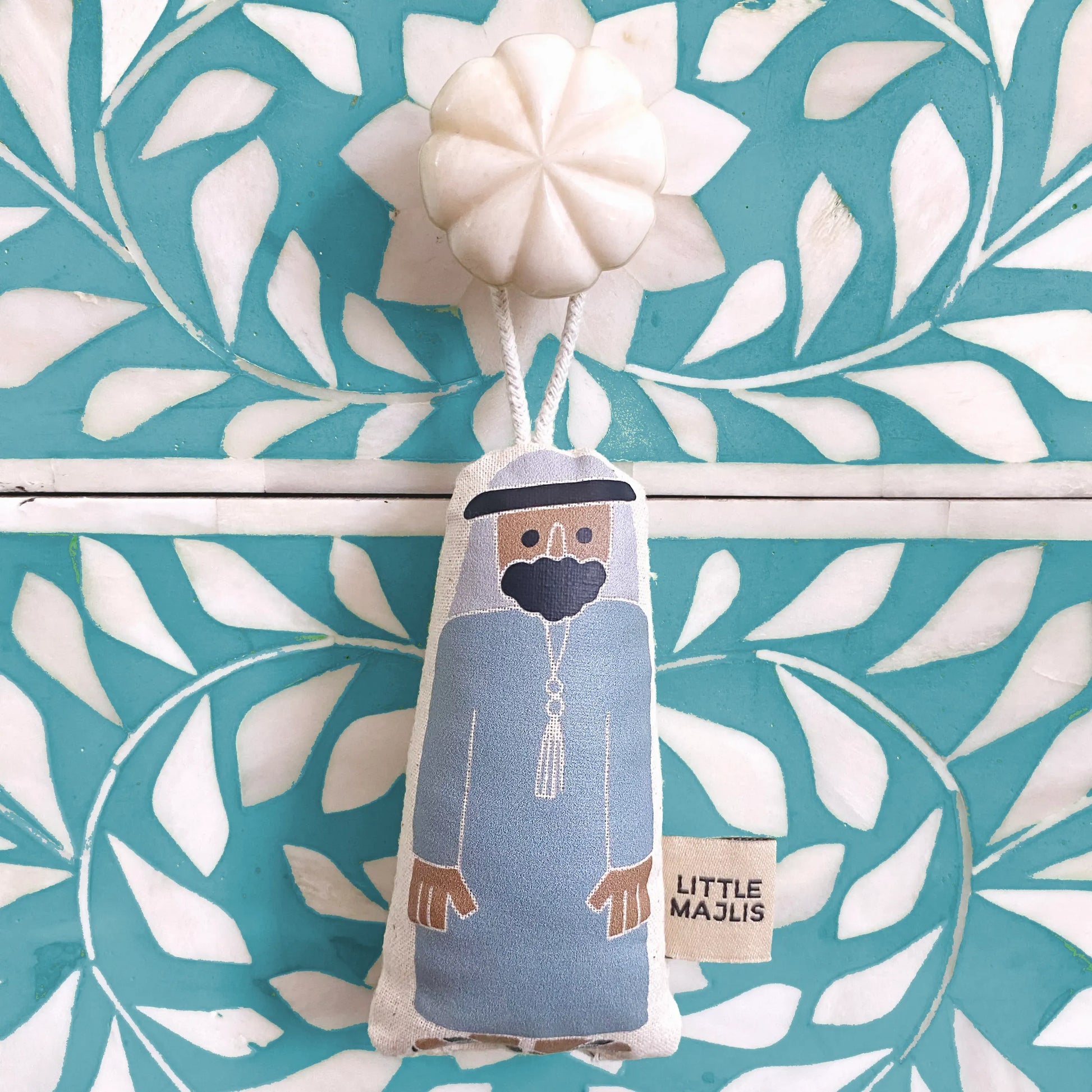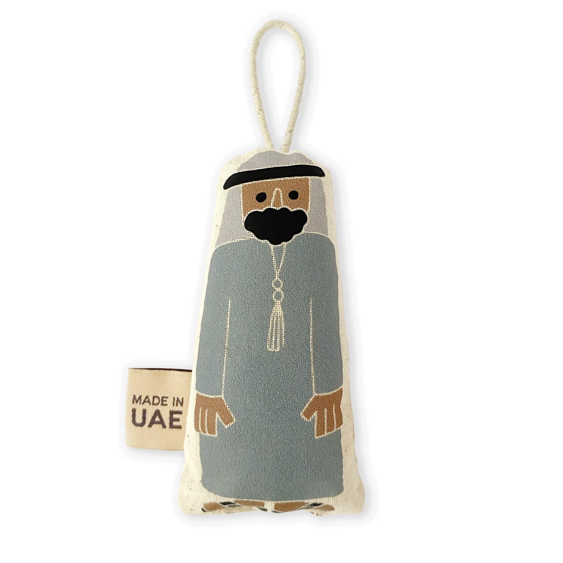 نحن نحب مجموعة الزينة الإماراتية المعلقة هذه من Little Majlis، وهذا الرجل الذي يرتدي الزي الوطني يستحق جائزة لحية العام! مصنوعة من القطن بنسبة 100% مع طباعة الشاشة على الأمام والخلف. مثالية لتزيين الهدايا أو ديكورات العطلات أو الإكسسوارات التي نستخدمها طوال العام (مثل سحر الحقيبة أو زينة مقبض الدرج). نظرًا لكونها لطيفة وصغيرة وغير قابلة للكسر، فهي مثالية لوضعها في حقيبة السفر كتذكار للإمارات.