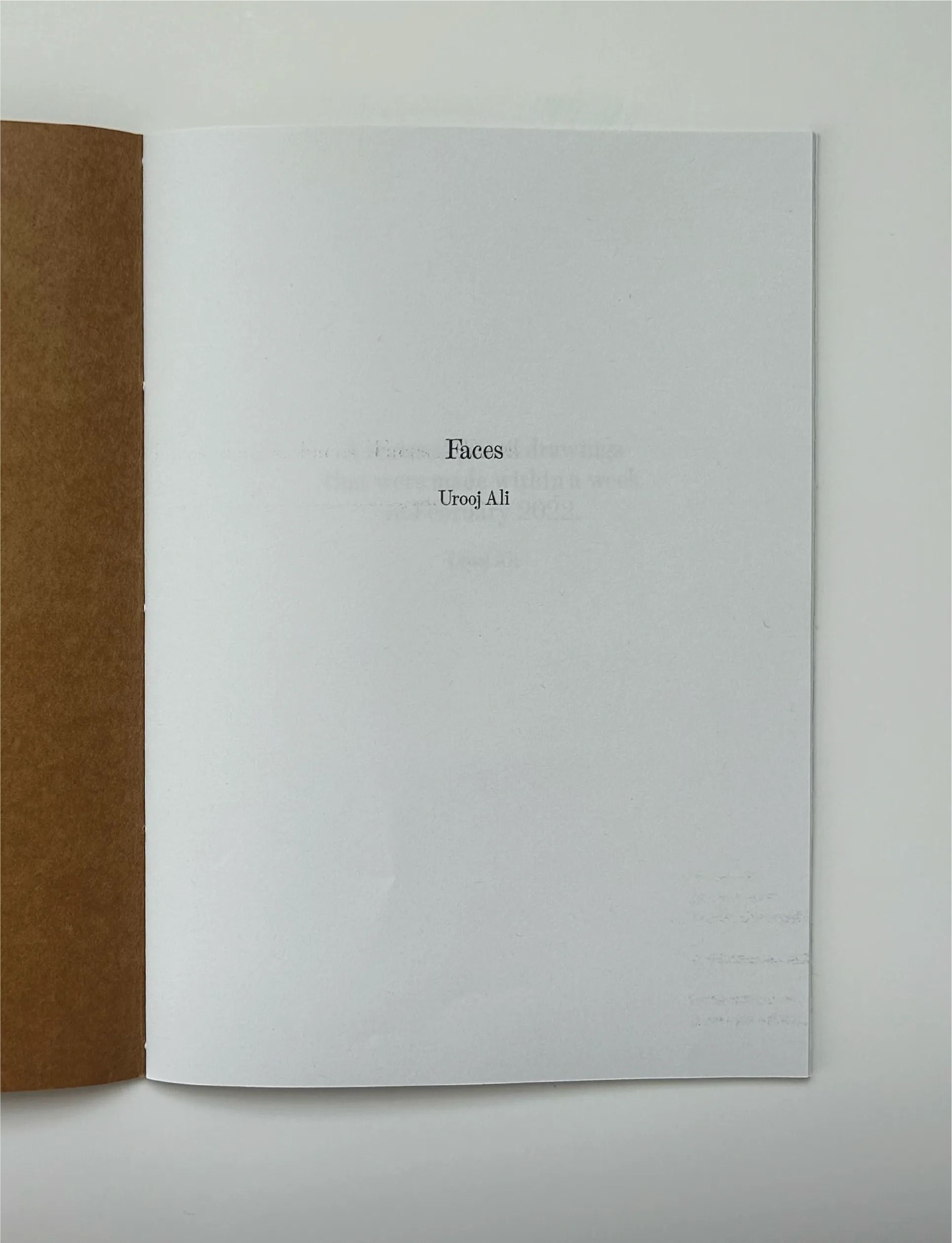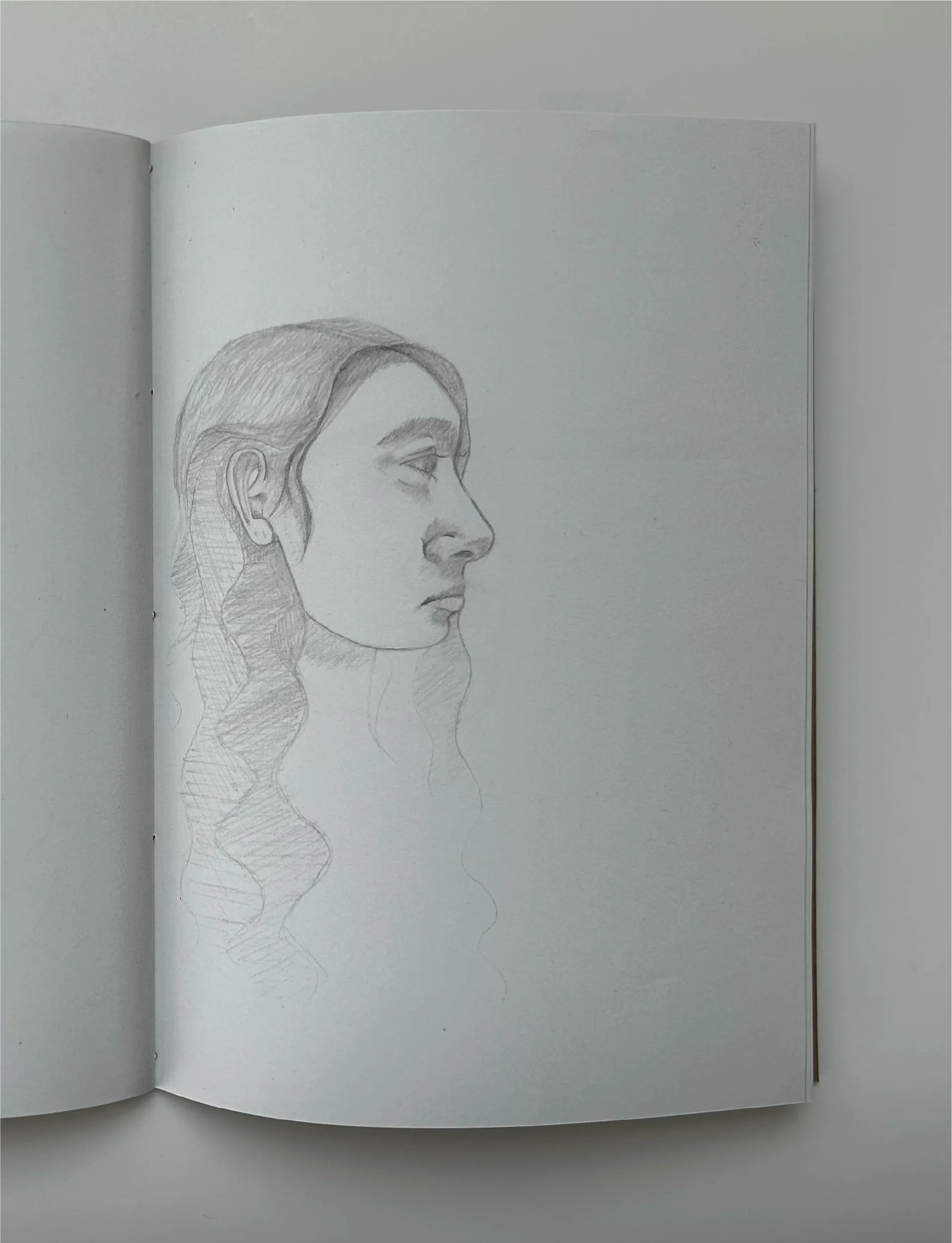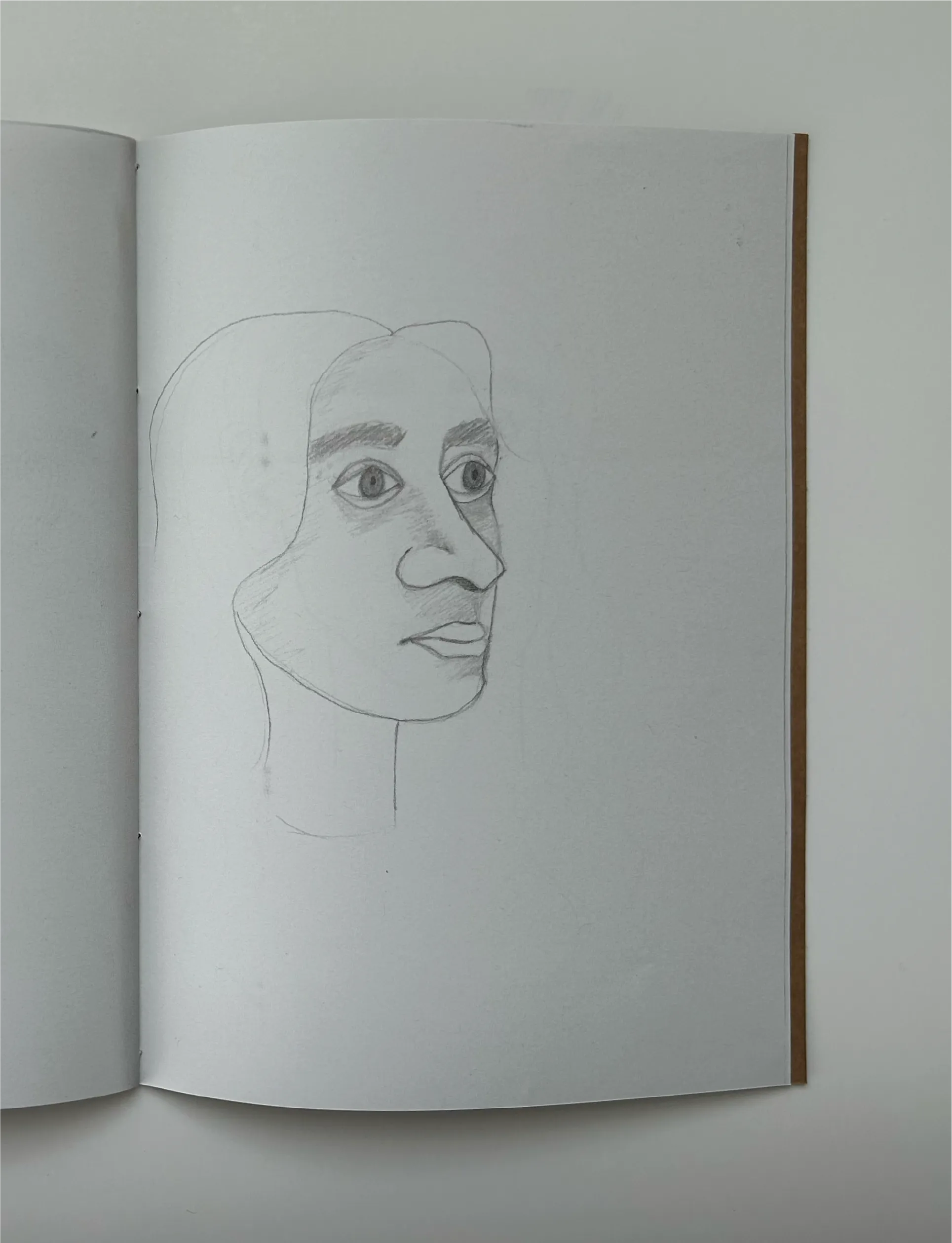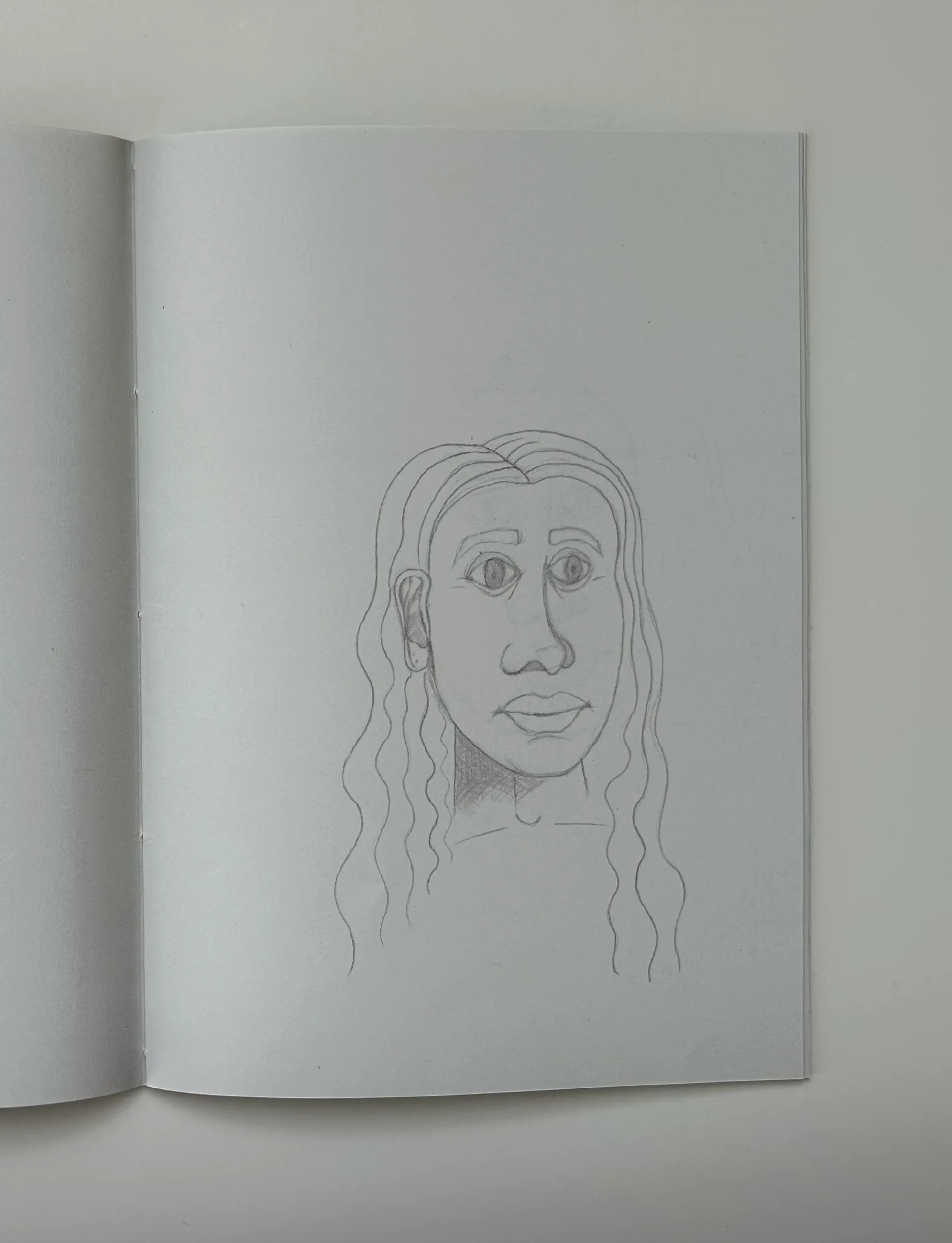 “A series of pencil drawings of the same face drawn in a variety of styles; made within a week in February 2022.”11 pages, A5, hand stitched.